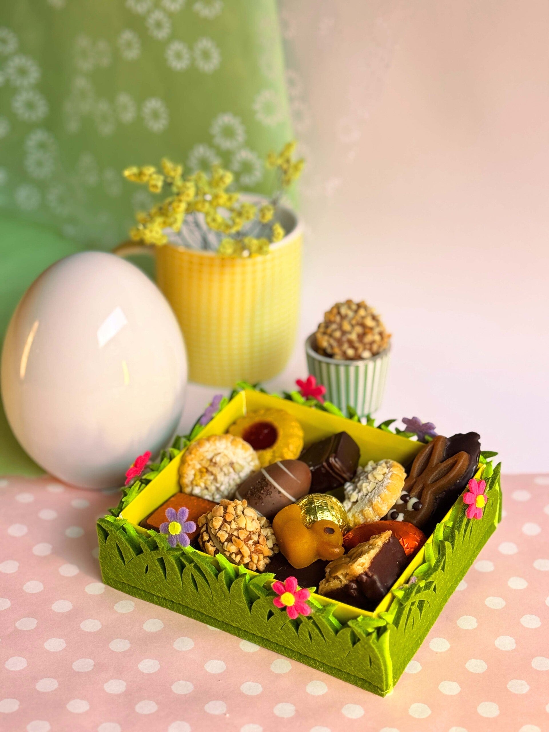 darunter handgemachte Pralinen. So fühlt sich Ostern an,